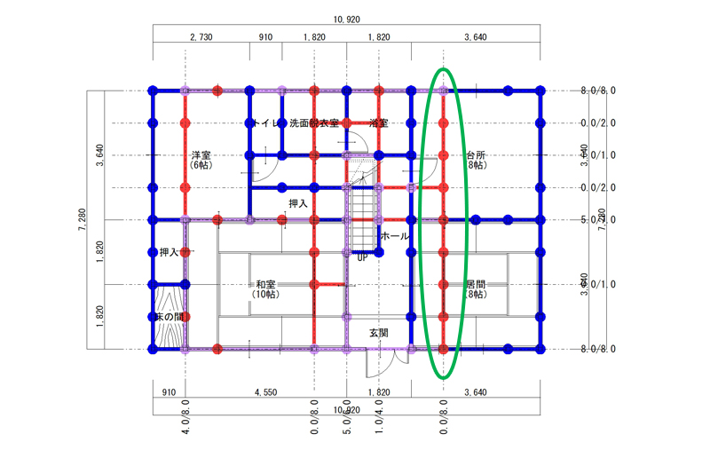 見方:青は1階の壁と柱、赤は2階の壁と柱、紫は1階と2階の壁と柱が一致している部分で、この紫が多いほど安全な建物となります。