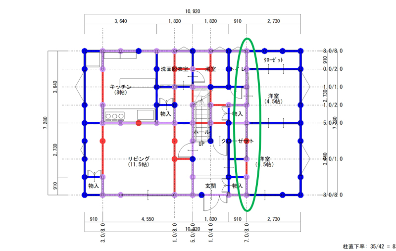 上の既存直下率の図と比較して、リノベーション後の左図は紫色が増えたことがわかります。また、一番の問題点であった緑で囲ったラインも上下階一致を表す紫へと変化しています。