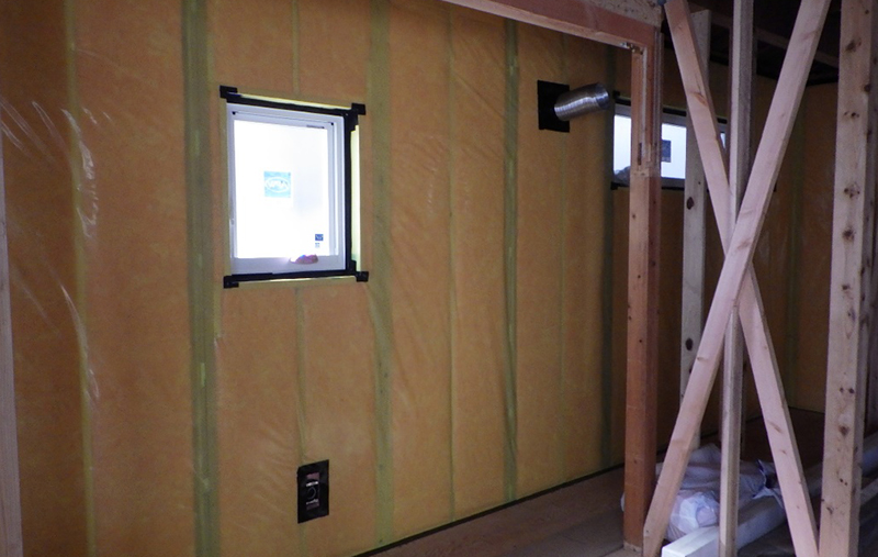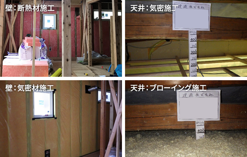 自社の新築と同じ高性能グラスウールを柱間に充填する方法です。断熱材充填後に気密シートを張って、サッシやダクト、コンセントなど空気が行き来しやすい部分を気密テープ等を用いて処理します。